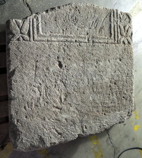 - Unterer Teil eines gerahmten Schriftfeldes, seitlich Rahmenleisten mit Blattornament.