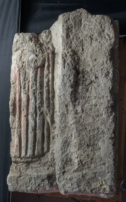 - links u. oben abgebr., Seitenwange vorn abgearbeitet. Farbreste.