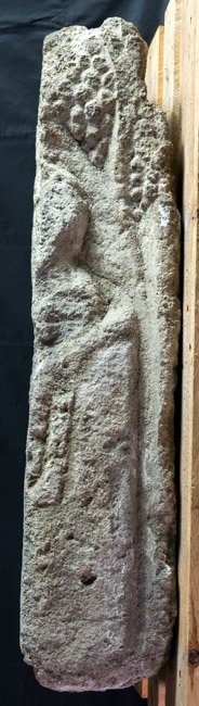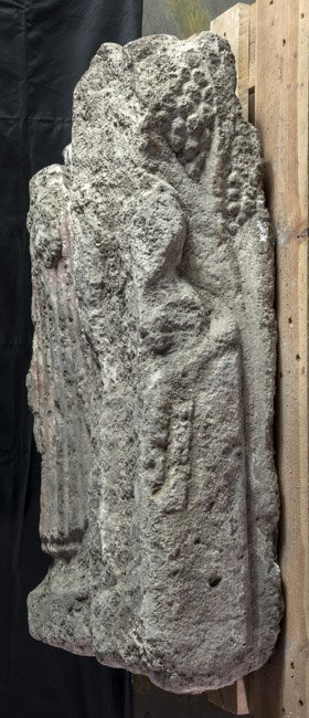 - Eckblock: auf der Vorderseite stehende Frau in Unter- und Obergewand mit langen Ärmeln. Rechts vorspringende Seitenwange, auf deren Außenseite unter einem Weinstock (?) in einem Sessel sitzende Figur (Mann ?).