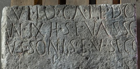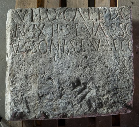 - ---]? / [---]rutio Caledo[nis ---] / [---] an(norum LX h(ic) s(itus) e(st) Vasso [---] / [M]ussonis f(ilius?) v(ivus?) s(ibi) e(t) co[n(iugi) / p(0suit)
