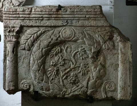 - Unter profiliertem Architrav auf Säulen Kranz mit Clipeus und Tänien, innen Weinranke, oben zwei Blätter.