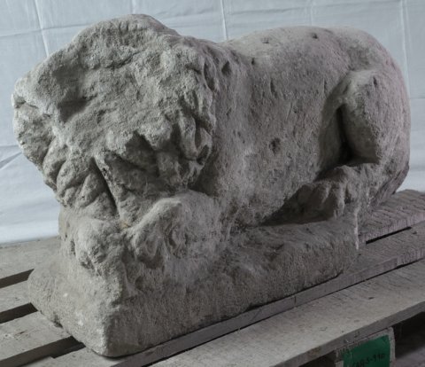 - auf Plinthe liegender Löwe, Tierkopf in den Vorderpranken