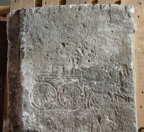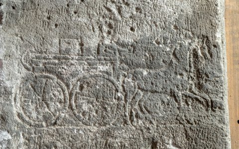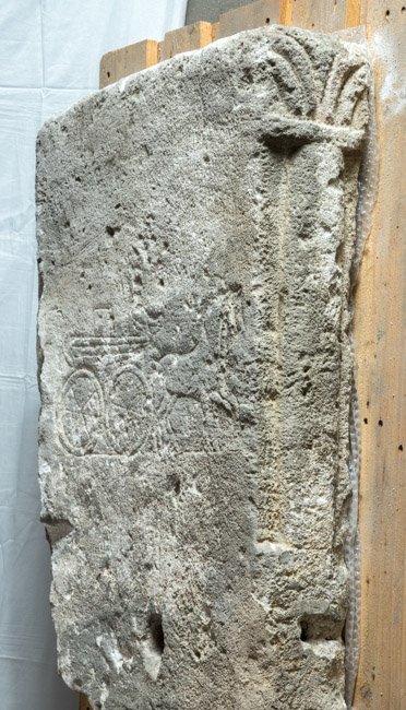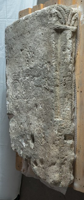 - Rechte Seitenwand eines Tumulus-Dromos mit Wagenszene (Ritzzeichnung). vierrädriger Wagen mit Zweigespann und Kutscher, auf der offenen Ladefläche viereckiger Behälter. Auf der Stirnseite der Platte Halbsäule.