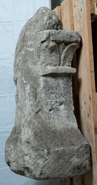 - glatter Pyramidenstumpf mit Blattkapitell und Rest eines Pinienzapfens