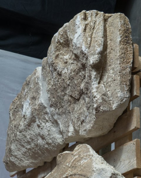 - Halbfiguren einer Familie: links Frau im Ärmelkleid mit breitem Gürtel und Brustschmuck, in der Mitte Frau im Mantel mit Bordüre, rechts Mann in Toga contabulata, in der Linken Rolle (volumen).