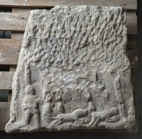 - Jagdszene: links stehender Mann, nach rechts laufender Hund, der einen Hasen verfolgt. Im Hintergrund Baumstämme.