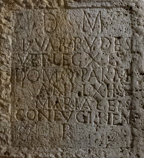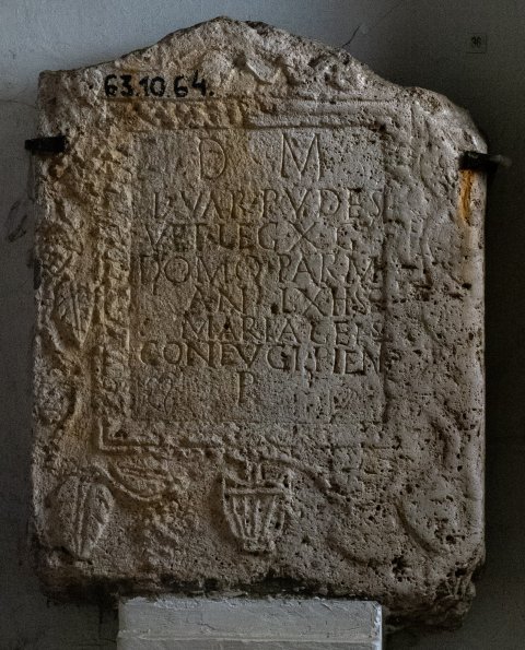 - D(is) M(anibus) / L(ucius) Var(ius) Pude(n)s / vet(eranus) leg(ionis) X g(eminae) / domo Parm(a) / an(norum) LX h(ic) s(itus) e(st) / Maria GEI S / coneugi (!) pient(issimo) p(osuit)
