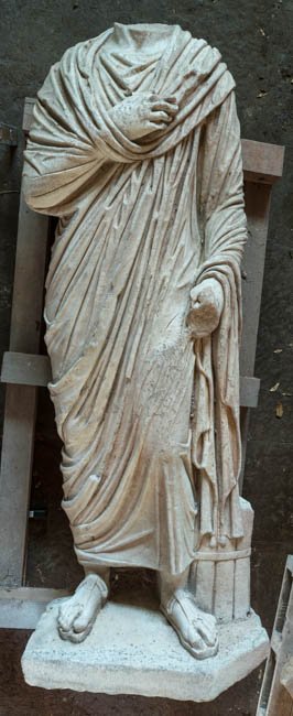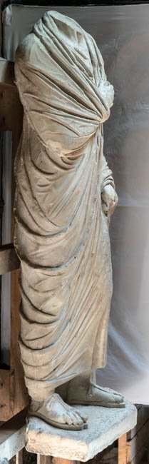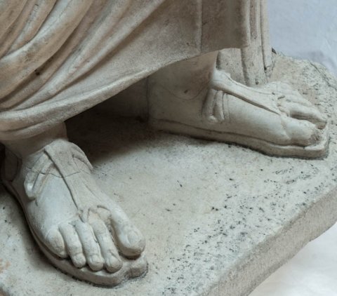 - stehender Togatus mit vorn offenen Schuhen, neben dem linken Fuß Rollenbehälter