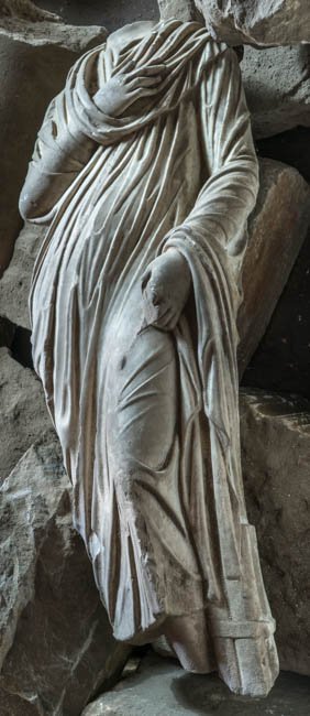 - stehender Togatus, neben dem linken Bein Rollenbehälter