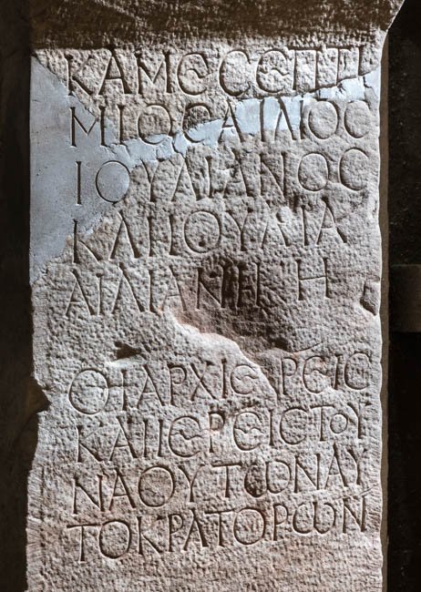 - griechisch: κάμε Σεπτί/μ̣ιος Αἴλιος / [Ἰ]ουλιανὸς / καὶ Ἰουλία / Αἰλία Νίκη / οἱ ἀρχιερεῖς / καὶ ἱερεῖς τοῦ / ναοῦ τῶν Αὐ/τοκρατόρων
