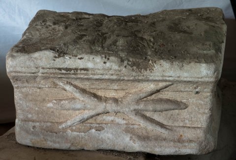 - Kubisches Postament mit Profilierung an drei Seiten. Auf der Vorderseite liegendes Blitzbündel.