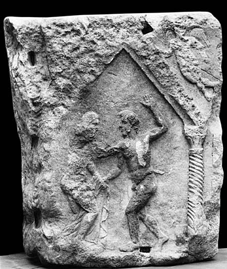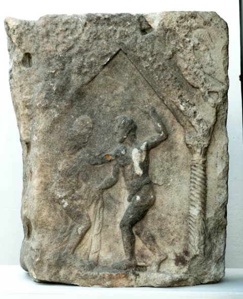 - Mythische Figuren, Genius: Giebel auf Säulen mit Spiralkanneluren, über den Schrägen fliegende Genien. Im Giebelfeld links Mänade, die einen nackten Satyr abwehrt, der ihr den Mantel wegzieht.