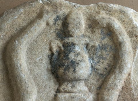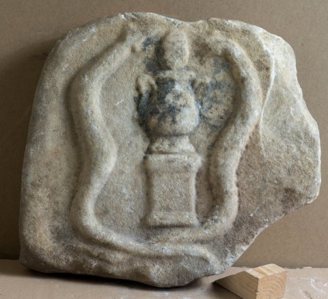 - Zwei aufgerichtete Schlangen flankieren ein Postament (Altar ?), auf dem eine Amphore mit Pinienzapfen steht.