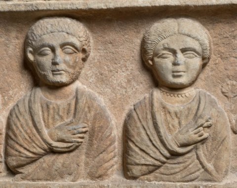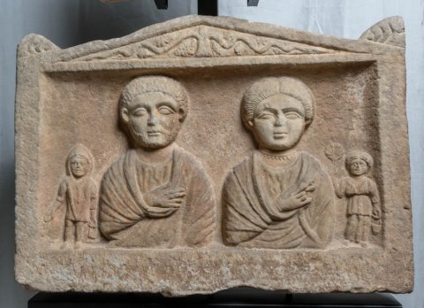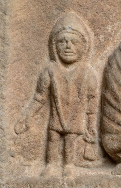 - Giebel mit Weinranken, Seitenakrotere. Im Bildfeld zwei Halbfiguren (Ehepaar), links bärtiger Mann, rechts Frau mit Halsband, in der Rechten Blüte (?). Seitlich je eine kleine Ganzfigur: links Mann (Diener) im Kapuzenmantel, in der Linken Tasche, in der Rechten ? Rechts Mädchen (Dienerin) mit Spiegel und Korb.