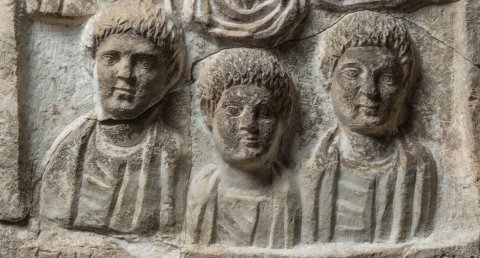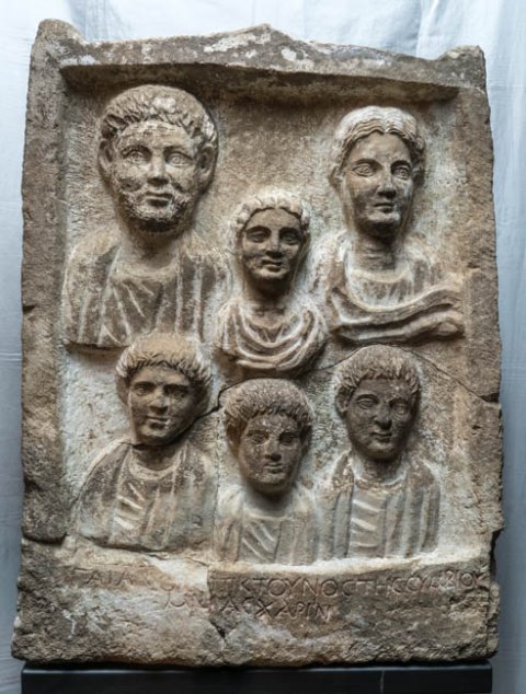 - Flacher Giebel mit Seitenakroteren. Im Bildfeld Büsten einer Familie. Oben bärtiger Mann, Mädchen mit Melonenfrisur, Frau. Unten drei Knaben