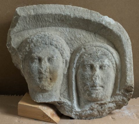 - Porträtköpfe von einer Familienstele. In der Mitte Jüngling, rechts Frau mit Schleier. Links schloss eine weitere Person an.