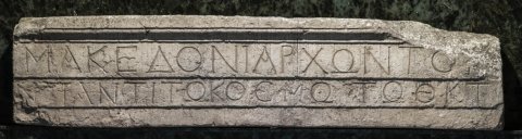 - griechisch: [---] μακεδονιαρχῶν τὸν ναὸν τῇ πατρίδι / [--- σὺ]ν παντὶ τῷ κόσμῳ τῷ θκτʹ ἔτει