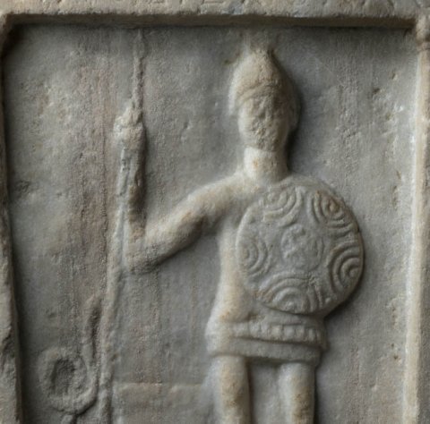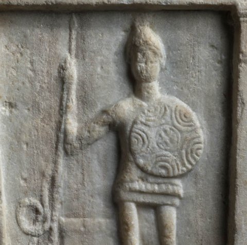 - Giebel mit Rosette und Akroteren, Bildfeld von Pilastern flankiert. Stehender Mann (Soldat) mit Helm Rundschild und Lanze, neben ihm Altar und Schlange.