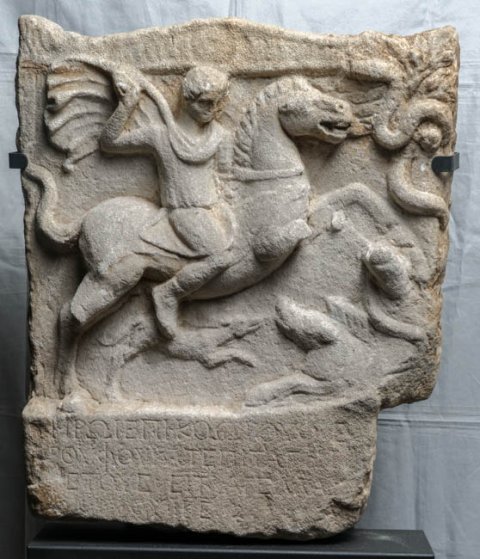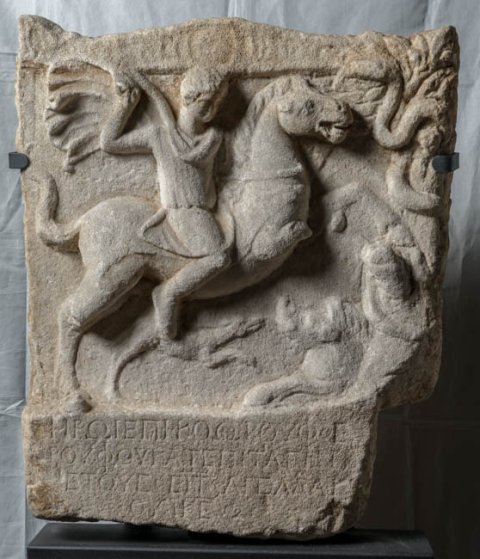 - Mythische Figur: nach rechts hin galoppierender Thrakischer Reiter mit Hund, vor ihm Eber und Baum mit Schlange. Giebel mit Seitenakroteren.