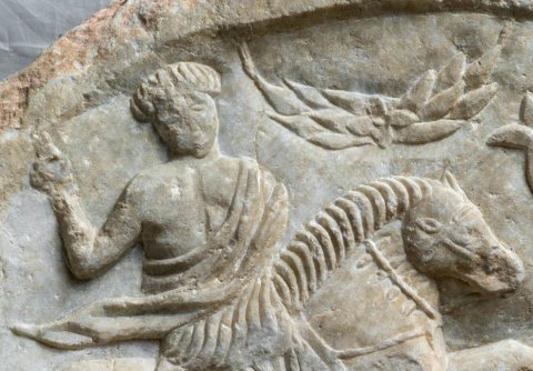 - Mythische Figur: Thrakischer Reiter im Galopp nach rechts, unter dem Pferd Hund, rechts Eber, Altar, Baum mit Schlange, über dem Pferdekopf Blattgirlande.