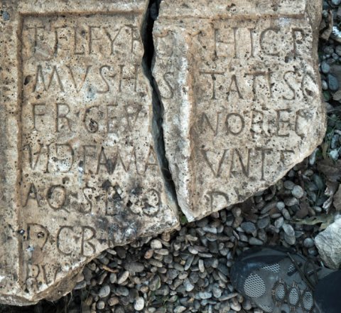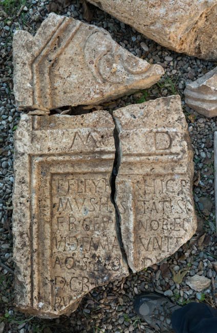 - M(anibus) D(is) // T(itus) Fl(avius) Fyr/mus(!) h(ic) s(itus) / frug<i>(?) Vi/vidae / ama(tae?) aq(ua?) s(i)b(i)(?) <qu>o/d(?) c(upierat?) b(o)n(us?) v[i]/r v(ivens?) an(nos) LXXV / vivo si/bi p(o)s(uit) // hic p[ie]/tatis (h)o/nor (ha)ec [s]/unt p[ia] / d(o)n(a) m(ari)t(i) / qui m(e) / d(i)l(i)git / Val(eriae) co(n)i(u)g(i) vix(it) (a)n(nos) L / Fl(avius) Fyrmus(!) / [coniugi?] b(ene) m(erenti) / p(o)s(uit)
