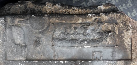 - Über dem Schriftfeld schmales Zwischenbild mit Totenmahl: vier auf einer Kline gelagerte Personen, darunter Tischchen. Links Gefäß (Krug ?) und Lehnsessel, darüber Griffspiegel.