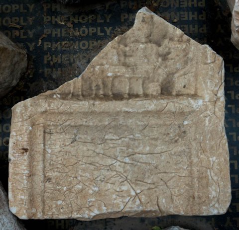 - Totenmahl: 2 Personen auf Kline, rechts Frau auf Lehnsessel, vorn Tischchen, links Beine eines Dieners (?). Schriftfeld leer.
