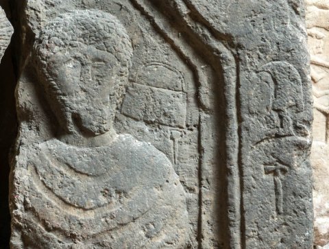 - Bildfeld mit Giebelabschluss, darin zwei bekleidete Büsten. Links Frau, neben ihrer rechten Schulter Kamm, unterhalb zwei ovale Objekte. Rechts bärtiger Mann, neben seiner Schulter Tasche (Polyptychon ?) und Stilus, auf dem Rahmen rechts Werkzeuge (Winzermesser, kleines Beil). Schriftfeld vertikal geteilt.
