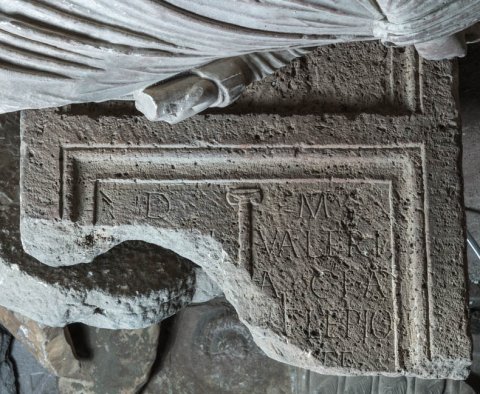 - 3 anpassende Fragmente, in der Inschrift links große Fehlstelle. Giebelspitze 2017 nicht gesehen.