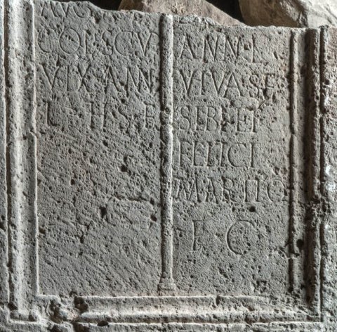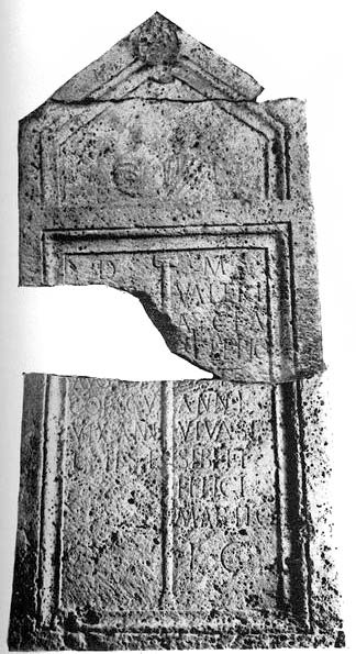 - Bildfeld mit Giebelabschluss, darin Büste und Brustbild, seitlich der Büste Kamm (?). In der Giebelspitze Pinienzapfen. Schriftfeld durch dünne Säule mit jonischem Kapitell vertikal geteilt.