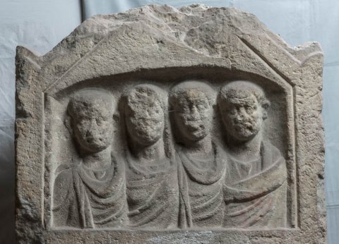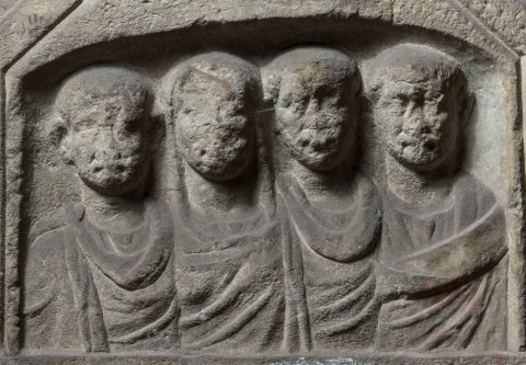 - Unter dem offenen Giebel Nische mit vier Brustbildern einer Familie. Von links: Mann im Sagum mit Armbrustfibel, Frau mit über den Kopf gezogenem Mantel, bärtiger Mann im Sagum, bärtiger Mann in Toga contabulata.