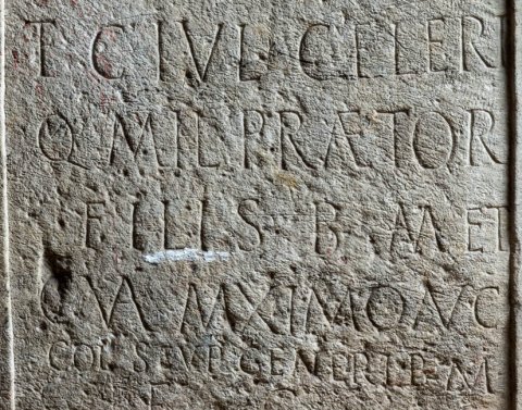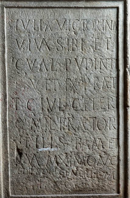 - D(is) M(anibus) // Iulia Victorina / viva sibi et / C(aio) Val(erio) Pudinti(!) / vet(erano) ex praet(orio) / et C(aio) Iul(io) Celeri / q(ui) mil(itat) praetor(ianus) / fili(i)s b(ene) m(erentibus) et / C(aio) Val(erio) Maximo Aug(ustali) / col(oniae) Scup(inorum) generi(!) b(ene) m(erenti) / f(aciendum) c(uravit)