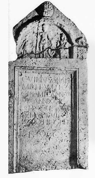 - C(aius) Vibius Arator / mil(es) frum(entarius) leg(ionis) VII / C(laudiae) p(iae) f(idelis) mil(itavit) ann(os) XVII / vix(it) ann(os) XXXX / h(ic) s(itus) e(st) / Iulia Obulcia / filio piissimo f(aciendum) c(uravit)