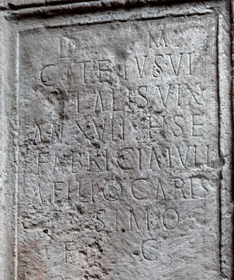 - D(is) M(anibus) / C(aius) Ateius Vi/talis vix(it) / an(nos) XVII h(ic) s(itus) e(st) / Fabricia Iuli/a filio caris/simo / f(aciendum) c(uravit)