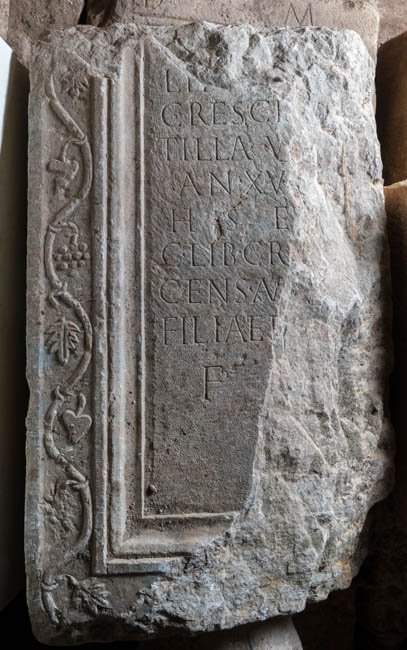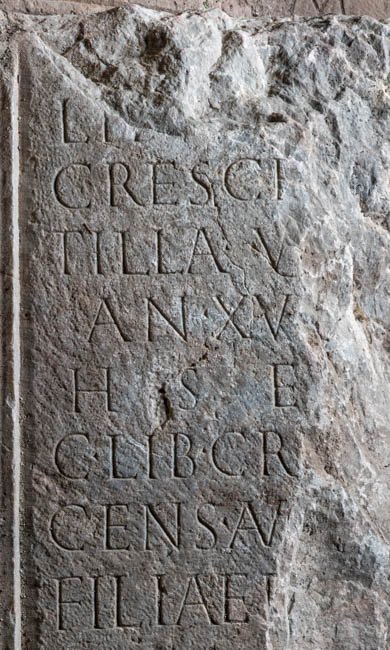 - ---] / Lib(---) [---] / Cresce[n]/tilla v[ix(it)] / an(nos) XV[---] / h(ic) s(ita) e(st) / C(aius) Lib(---) Cr[es]/cens Au[g(ustalis?)] filiae p(iae) / f(aciendum) [c(uravit)]