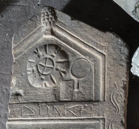 - Im Giebelfeld Rosette, Kamm und Spiegel, in der Giebelspitze Pinienzapfen.
