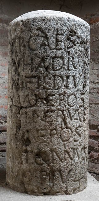 - Imp(erator) Caes(ar) / divi Hadri/[a]ni fil(ius) divi / [T]raiani nepos / divi Nervae / pronepos / Antoninus / Aug(ustus) Piu(s) / [res]tituit / [m(ilia) p(assuum) VIIII]