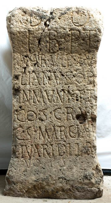 - D(e)o / L(i)b(ero) P(a)t(ri) / Mar(cus) Ulp(ius) Iu/lianus ob / inmunit(a)t(em!) / co(n)s(e)cr(a)vi(t) / c(on)s(acranorum) Marciani / et Varidi l(i)b(ertorum?) vo(tum) p(o)s(uit)