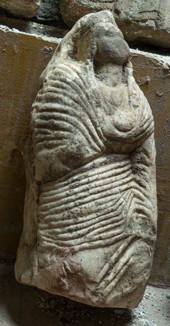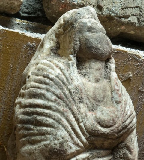 - Ganzfigur einer stehenden Frau im Mantel, in der rechten Hand Frucht. Teil einer Familienstele ?