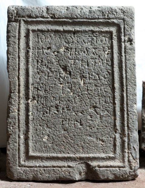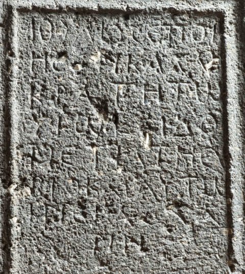 griechisch: Ἰούλιος ἐποί/ησεν Καλλι/κράτη τῷ / υἱῷ καὶ Δο/μετίᾳ τῇ συ/βίο (!) καὶ αὑτῷ /