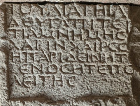griechisch: Ἰουλίᾳ τῇ ἰδί/ᾳ θυγατρὶ Τερ/τίᾳ μνήμης / χάριν. χαιρέσ/η παριδεῖν ἤτ[ε] /