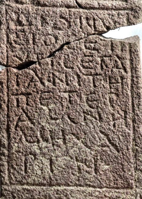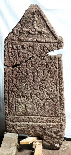 - Stele mit Giebel. Im Giebelfeld Rundschild mit drei Pfeilen (Kreuzzeichen ?).