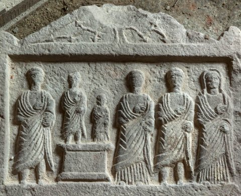 - Giebel mit Rankenornament (?), Seitenakrotere. Im Bildfeld Familie: Ganzfiguren von vier Erwachsenen und zwei auf einem Postament stehenden Kindern. Von links: Mann, Knabe, Mädchen, Frau, Mann, Frau mit über den Kopf gezogenem Mantel.