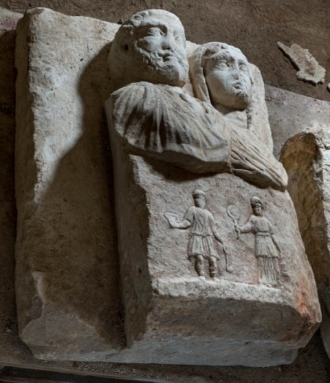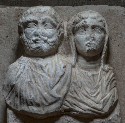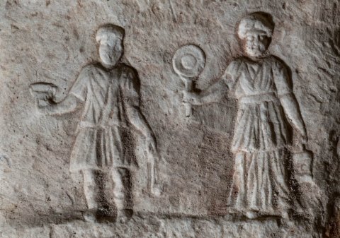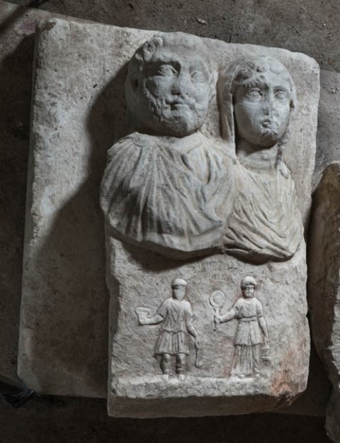 - Platte mit pilasterartigem Vorsprung. Oben zwei Büsten (Ehepaar): links bärtiger Mann, Mantel mit Scheibenfibel auf der linken Schulter, rechts Frau mit Schleier. Unterhalb zwei kleinformatige Figuren, links Diener in kurzer Tunica, in den Händen Becher und Schöpfkelle, rechts Dienerin mit Spiegel und Kästchen.