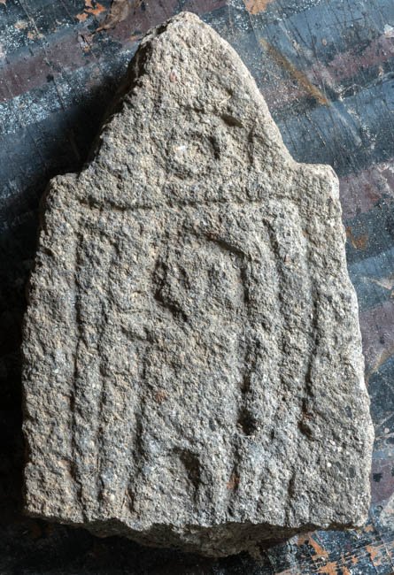 - Stele mit Giebel, darin Schale. Relieffeld durch Linien gerahmt. Stehender Mann, rechter Arm erhoben ?