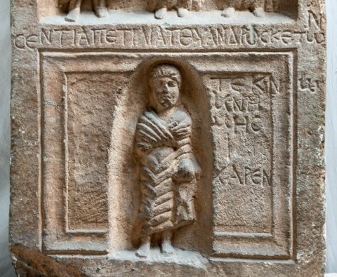 - griechisch: Σεντία Πετιλία τθῦ(!) ἀνδρὸς κὲ τῶν //τέκνω(ν) μνή/μης / [[ιεk]] / χάρεν(!)