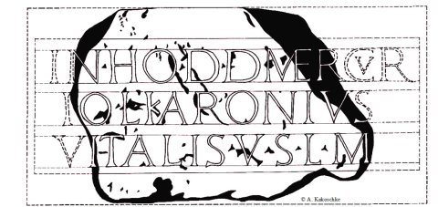 - [I]n ho(norem) d(omus) d(ivinae) Me[rcur]/[i]o L(ucius) Karoniu[s] / [V]italis v(otum) s(olvit) l(ibens) m(erito)
