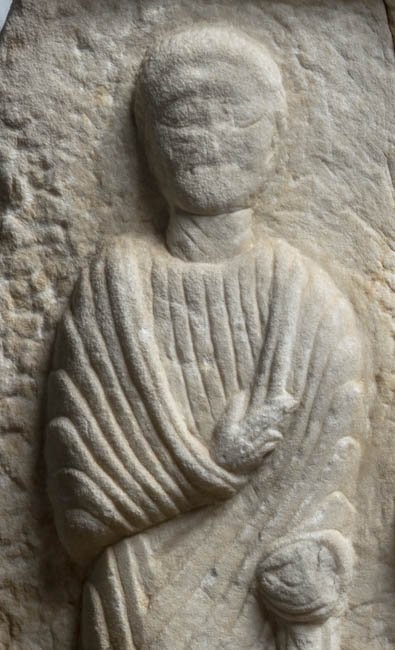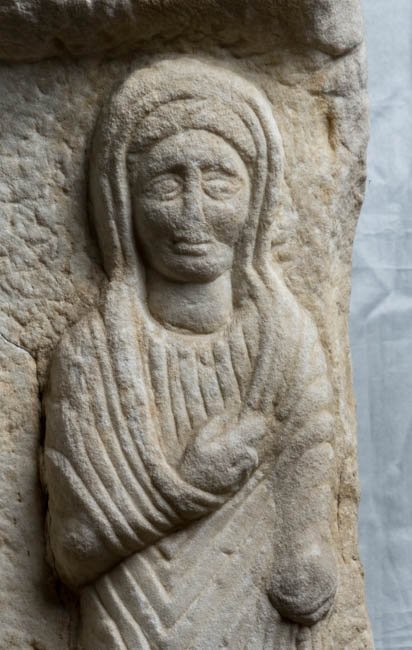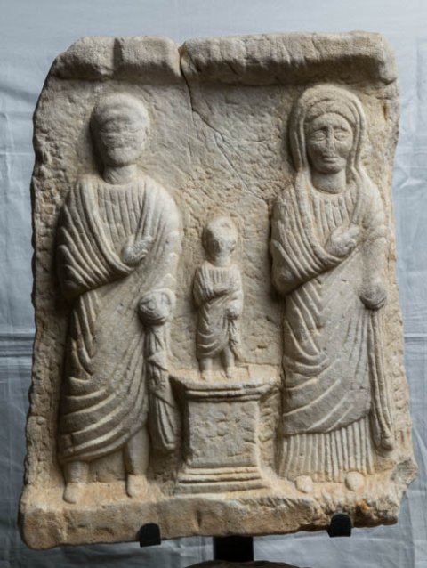 - Platte mit vorspringender Leiste oben und unten. Drei stehende Personen (Familie): Mann, Kind (Knabe) auf Postament, Frau,