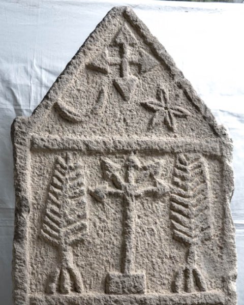 - Im Giebelfeld Kreuz aus Pfeilen, Mondsichel, Stern. Im Bildfeld drei Bäume.