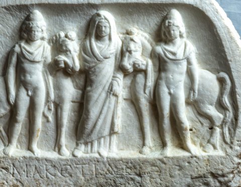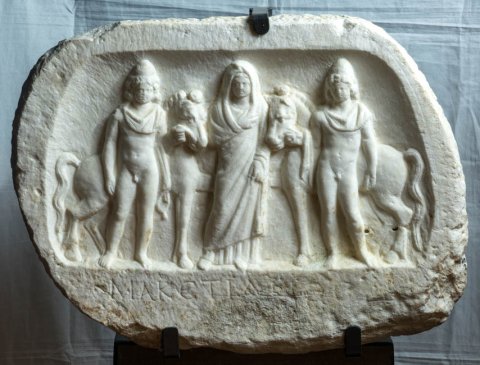 - Donaureiter (Dioskuren): in der Mitte stehende Göttin (?) mit über den Kopf gezogenem Mantel, flankiert von zwei vor ihren Pferden stehenden Jünglingen mit Schultermantel und Pileus.
